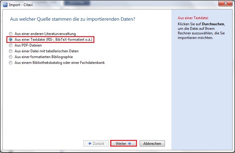 2. Wählen Sie "Aus einer Textdatei". Klicken Sie auf "weiter".