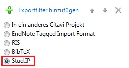 Steht der Filter noch nicht zur Verfügung, klicken Sie auf "Exportfilter hinzufügen", wählen "Stud.IP" aus der Liste und bestätigen mit einem Klick auf "hinzufügen."