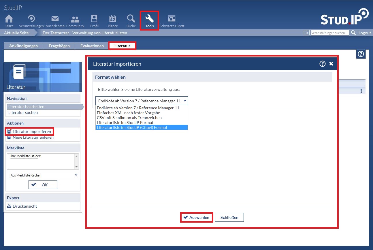 Klicken Sie auf "Tools" in der Kopfleiste und wählen Sie den Reiter "Literatur". Links in der Sidebar wählen Sie "Literatur importieren". Im Drop-Down-Menü wählen Sie das entsprechende Format (Literaturliste im Stud.IP (Citavi) Format". Klicken Sie auf Durchsuchen, um die Datei, die Sie aus Citavi erstellt haben, auszuwählen. Mit einem letzten Klick auf "Importieren" schließen Sie den Vorgang ab.
