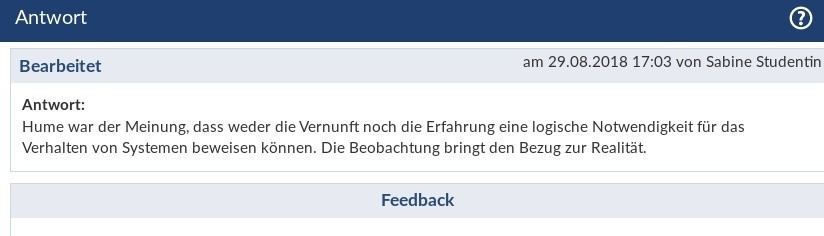 Zur Ansicht der einzelnen Antworten der Studierenden klicken Sie auf das entsprechende blaue Häkchen in der Spalte „Antwort“. So sieht bspw. die Antwort auf eine Single oder Multiple Choice-Frage aus: