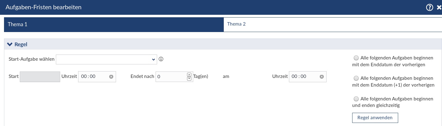 Wenn die "Aufgabe 2 in Thema 1" keiner Reihenfolgeposition zugeordnet wird, wird bei ihr auch kein Bearbeitungszeitraum eingetragen.