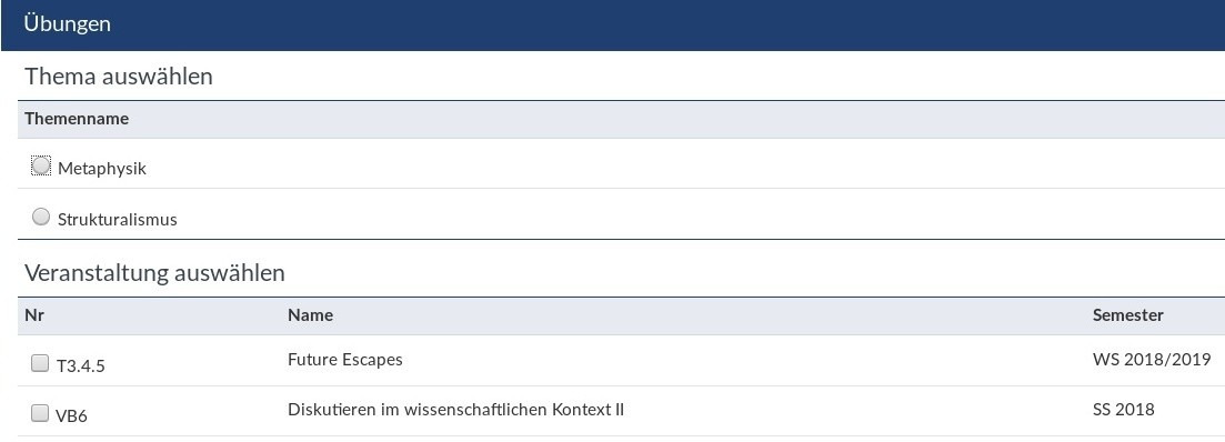 Wenn Sie im linken Menü auf „Thema exportieren“ klicken, können Sie sämtliche in der aktuellen Veranstaltung existierenden Themen zum Kopieren anwählen: