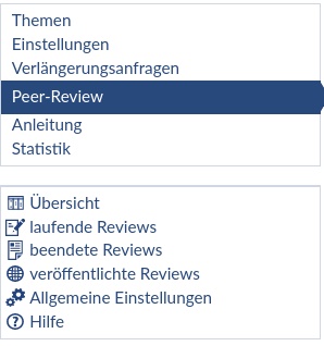 Unter dem oben erwähnten Menüpunkt finden sich Übersichten und Einstellungen, um das Review-Verfahren zu initiieren und zu begleiten.