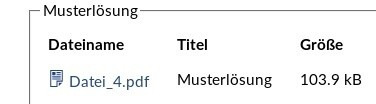 Die Liste der Dateien bietet Bearbeitungsfunktionen, die abhängig von den Berechtigungen in Stud.IP sind. Das obige Beispiel zeigt die Dateiliste für eine Aufgabe aus Sicht der Lehrenden. Die Teilnehmenden bekommen die Liste so dargestellt: