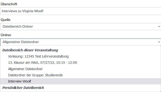 Im Feld Quelle wird festgelegt, ob die Audio-Dateien von einer externen URL-Adresse oder aus dem Stud.IP-Dateibereich eingebunden wird.