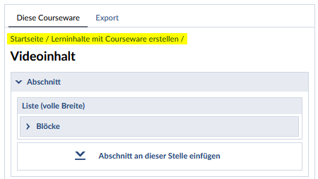 Durch Anklicken von Seiten explorieren Sie tiefer gelegene Inhalte Ihrer Courseware. Um die konkreten Blöcke auf einer Seite sehen zu können oder Blöcke in einen Abschnitt zu verschieben oder zu kopieren, klicken Sie im gewünschten Abschnitt auf die Schaltfläche Blöcke: