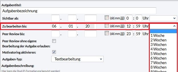 - Erstellen Sie eine neue Aufgabe in Ihrem Thema. Dabei liegt die Aufmerksamkeit auf der Einstellung "Zu bearbeiten bis". Legen Sie fest, bis zu welcher Zeit die Aufgabe zu bearbeiten ist. Geben Sie zusätzlich einen Zeitraum von einer Woche bis zehn Wochen, per Auswahlliste an. Dieser Zeitraum legt fest, in welchem Zeitraum eine mögliche Verlängerung der Bearbeitungszeit höchstens stattfinden soll.