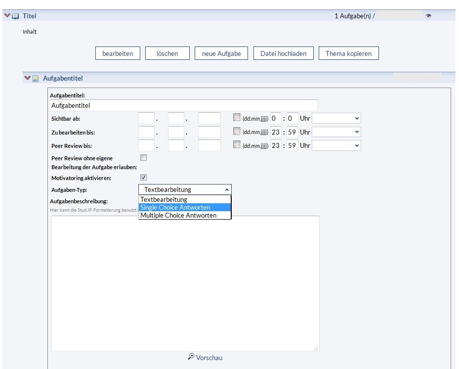 Wählen Sie in einem Thema aus "Aufgabe erstellen" aus. Sie erhalten ein Bearbeitungsformular für die neue Aufgabe.