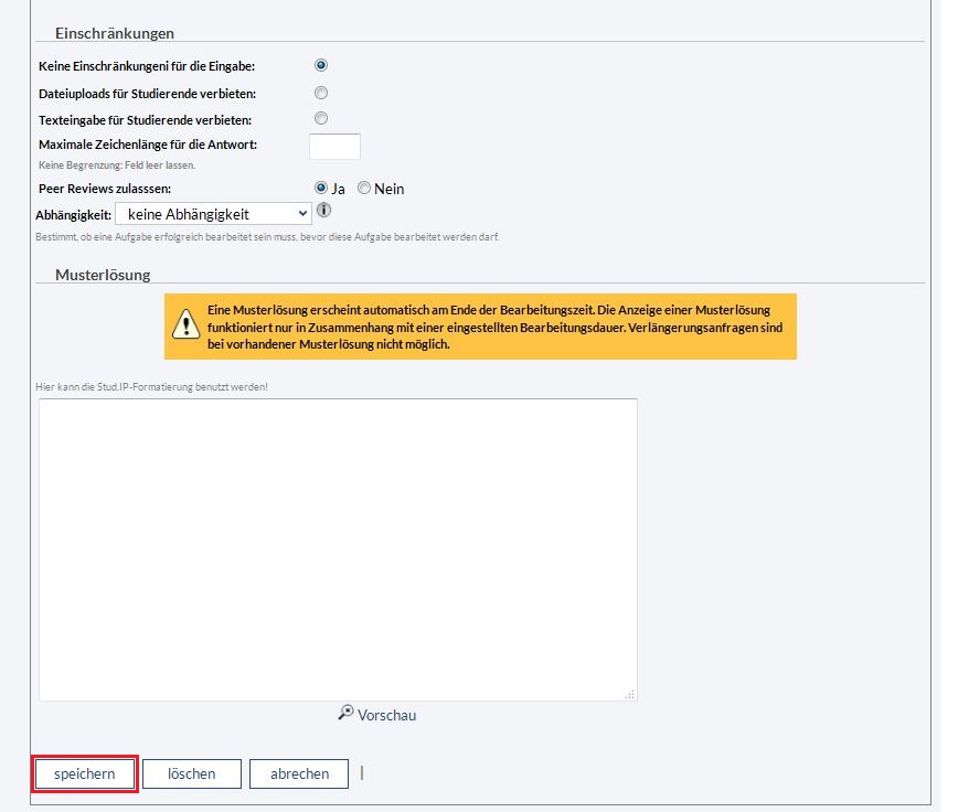 Falls Sie es nicht wünschen, dass Studierende Dateien hochladen oder eine maximale Zeichenlänge für die Antwort gesetzt sein soll, ist dies ebenfalls einstellbar. Die Option Abhängigkeit bestimmt, welche Aufgabe bereits erfolgreich bearbeitet sein muss, damit diese Aufgabe zur Bearbeitung freigegeben wird. Es ist empfehlenswert, diese Option nur zu verwenden, wenn Sie keine sonstigen Bearbeitungszeiträume eingestellt haben.