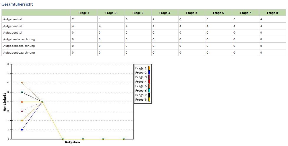 In der ersten Tabelle, mit dem Namen Gesamtübersicht, werden alle Antworten der Fragen nach den Aufgaben unterteilt.