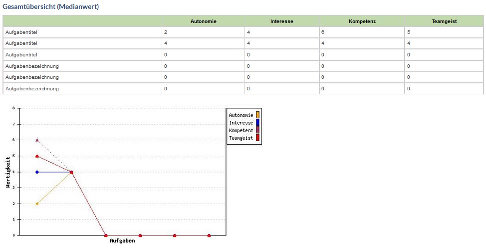 In der zweiten Tabelle, mit dem Namen Gesamtübersicht (Medianwert), werden die Antworten nach Kategorie und Aufgaben unterteilt.