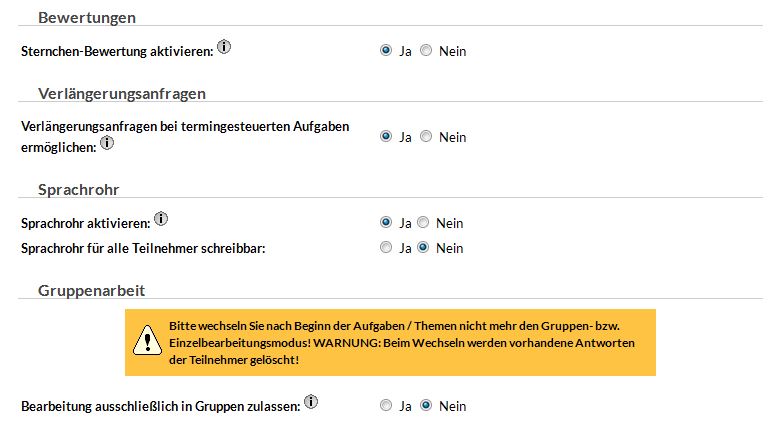 Bitte beachten Sie: Wechseln Sie den Einzel-/Gruppenmodus nicht mehr, wenn die Bearbeitung der Aufgaben bereits gestartet ist. Bei einem Wechsel werden alle vorhandenen Antworten gelöscht!