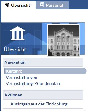 Es müssen nicht alle im Folgenden beschriebenen Reiterkarten und Unterpunkte bei einer Einrichtung auftauchen - bestimmte Funktionen können von den Administratoren deaktiviert werden.