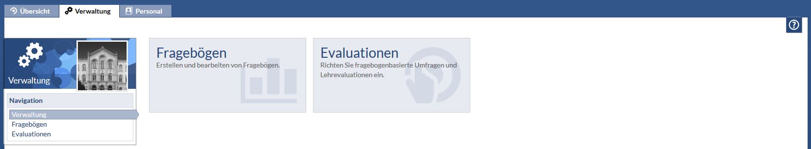 Die Reiterkarte "Verwaltung" erscheint nur, wenn Sie mindestens als TutorIn an dieser Einrichtung eingetragen sind. Auf dieser Seite können Sie Fragebögen und Evaluationen anlegen.