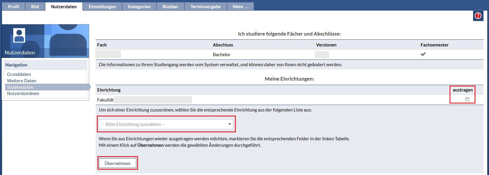 Aus verschiedenen Gründen kann es vorkommen, dass eine Zuordnung zu einer Einrichtung geändert werden soll. Um die Zuordnung zu wechseln, können Sie unter dem Menüpunkt "Profil", unter der Registerkarte "Nutzerdaten", in der Navigation, die "Studiendaten" auswählen. In dieser Ansicht wird Ihnen Ihr Studiengang angezeigt, sowie die Einrichtung der Sie zugeordnet sind. Um sich einer Einrichtung zuzuordnen, wählen Sie die entsprechende Einrichtung aus der Liste und klicken auf "übernehmen". Das Austragen erfolgt mit dem Setzten eines Häkchens bei "austragen", rechts neben der Veranstaltung. Klicken Sie anschließend wieder "übernehmen".