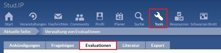Sie müssen sich auf der Administrierungsseite der Veranstaltung befinden, in der Sie die Evaluation veröffentlichen wollen. Dort klicken Sie auf den Unterpunkt Evaluationen.