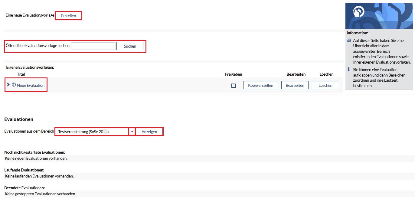Im 4. Bereich sehen Sie eine Übersicht, über alle Ihre Evaluationen: die, die noch nicht laufen, die die momentan laufen und die, die nicht mehr laufen. Haben Sie noch keine Evaluationen veröffentlicht, ist dieser Bereich leer - wie im obigen Beispiel.