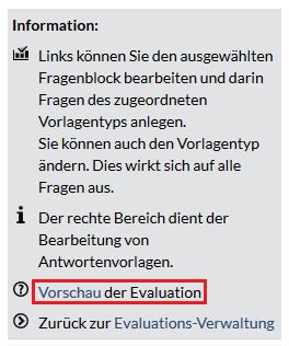 Um die Vorschau zu öffnen, wählen Sie das Fragezeichen vor dem Titel der Evaluationsvorlage aus oder wählen in dem Bearbeitungsmodus Vorschau der Evaluation aus.