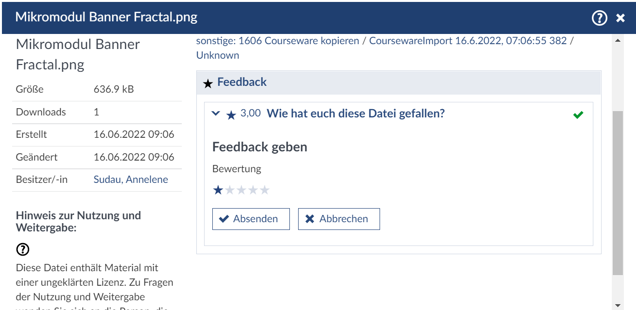 Wenn das Feedback-Modul in Ihrer Veranstaltung aktiviert ist, finden Sie im Aktionsmenu von Dateien die Aktion: Neues Feedback-Element