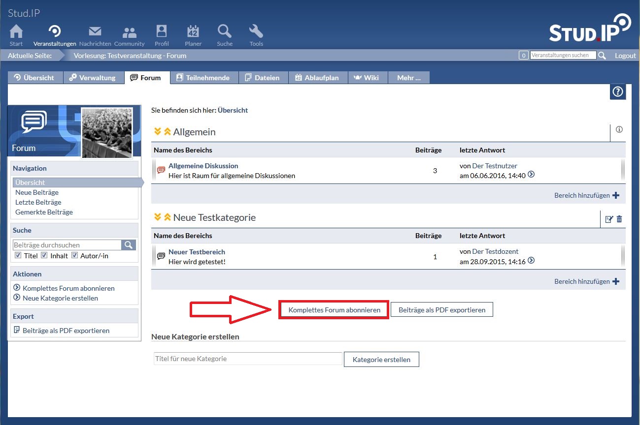 Sie können das komplette Forum abonnieren, um Stud.IP -interne Nachrichten zu bekommen, falls im Forum neue Beiträge verfasst werden und ersichtlich sind. Dies können Sie auch auf den darunter liegenden Ebenen machen, sprich nur einzelne Bereite oder Themen abbonieren, um bei neuen Beiträgen benachrichtigt zu werden.