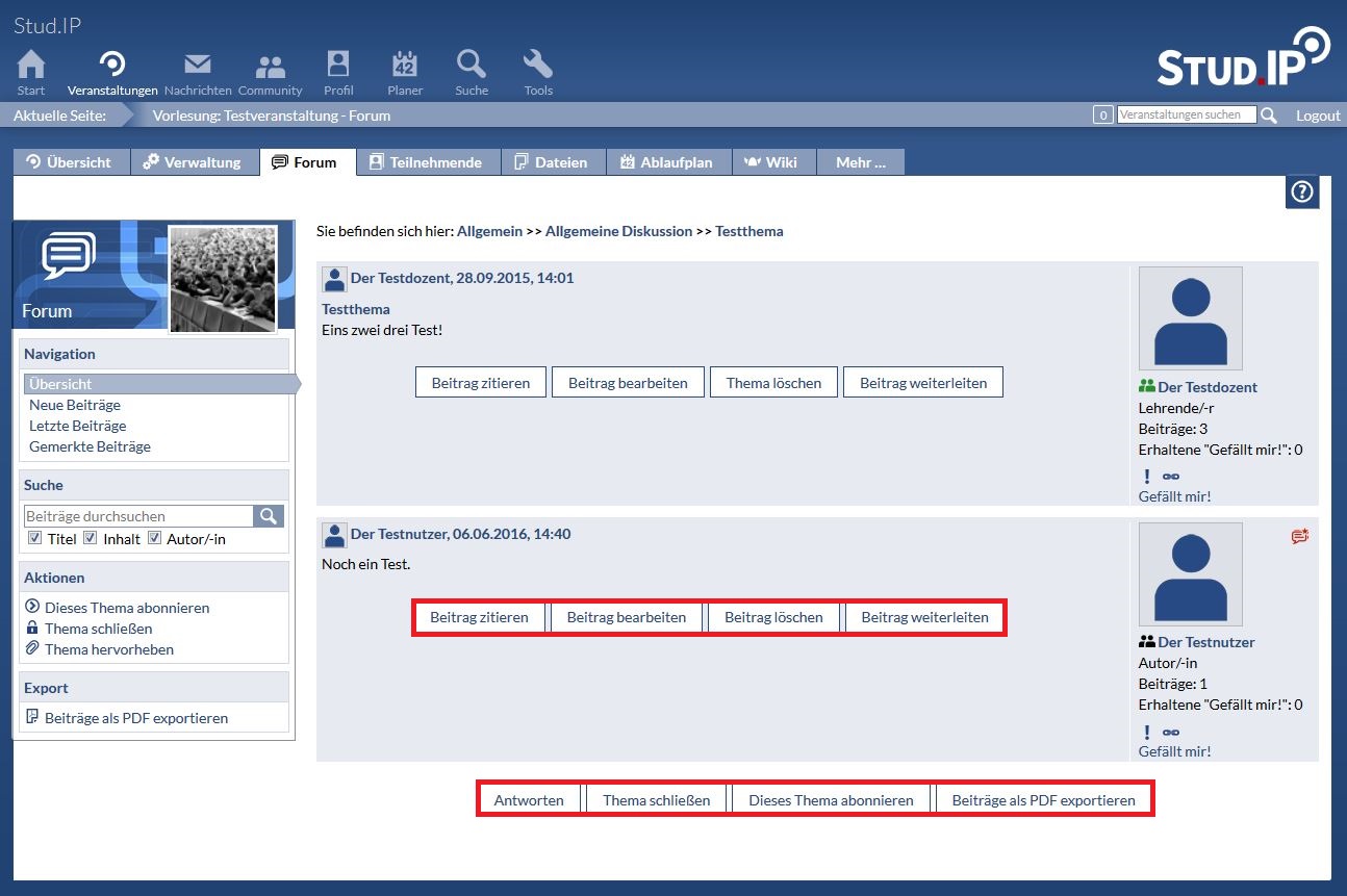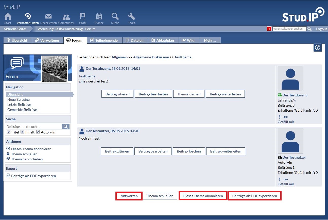 Sie selbst haben jetzt drei Möglichkeiten. Sie können aktiv in der Diskussion teilnehmen, indem Sie Ihre Meinung kundtun. Klicken Sie hierzu auf „Antworten“. Zusätzlich können Sie das jeweilige Thema abonnieren, um eine Stud.IP-interne Nachricht zu erhalten, falls ein neuer Beitrag in dem Bereich verfasst wurde. Klicken Sie hierzu auf „ Dieses Thema abonnieren “. Zuletzt haben Sie die Möglichkeit die verfassten Beiträge als PDF zu exportieren, indem sie auf „Beiträge als PDF exportieren“ klicken.
