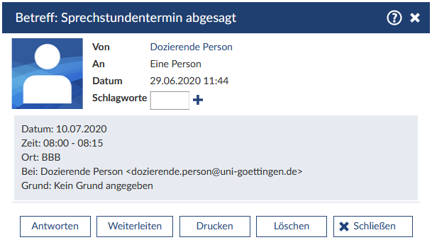 Die jeweiligen Personen erhalten eine Nachricht über die Absage und die ursprünglich gebuchten Termine verschwinden aus Ihrem persönlichen Terminplaner.