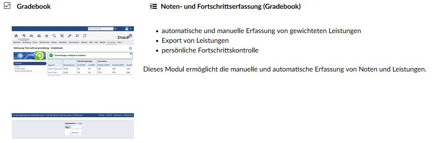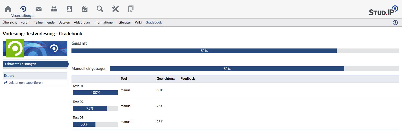 Das Gradebook ist ein Plugin, welches die Noten- und Fortschrittserfassung ermöglicht. Zudem kann mit dem Gradebook die manuelle und automatische Erfassung von Noten und Leistungen erfolgen. Außerdem kann mit dem Gradebook folgendes gemacht werden: