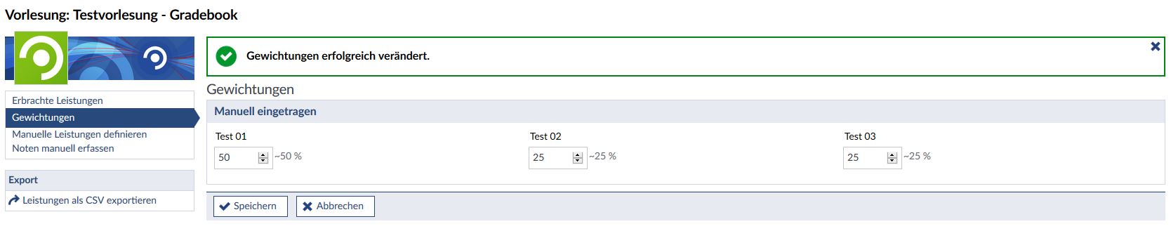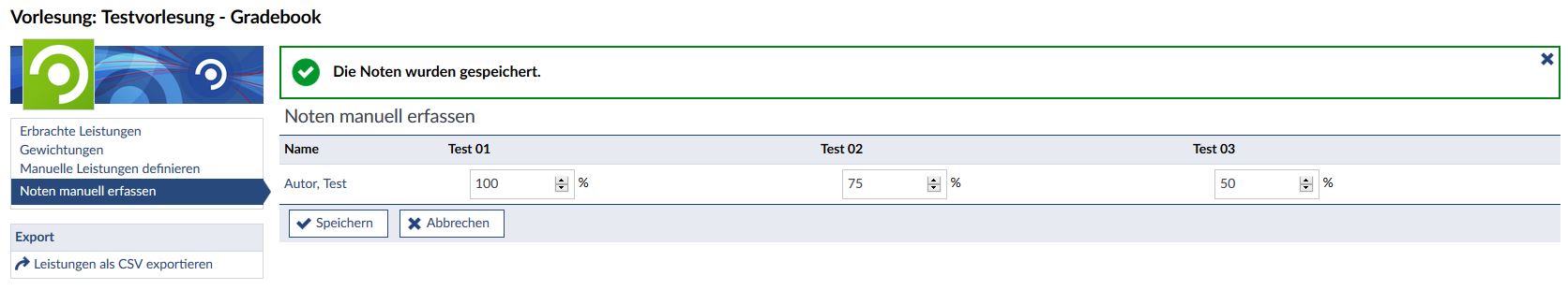 Bitte speichern Sie Ihre Einstellungen. Sie bekommen dann eine Meldung, dass die Noten gespeichert wurden.