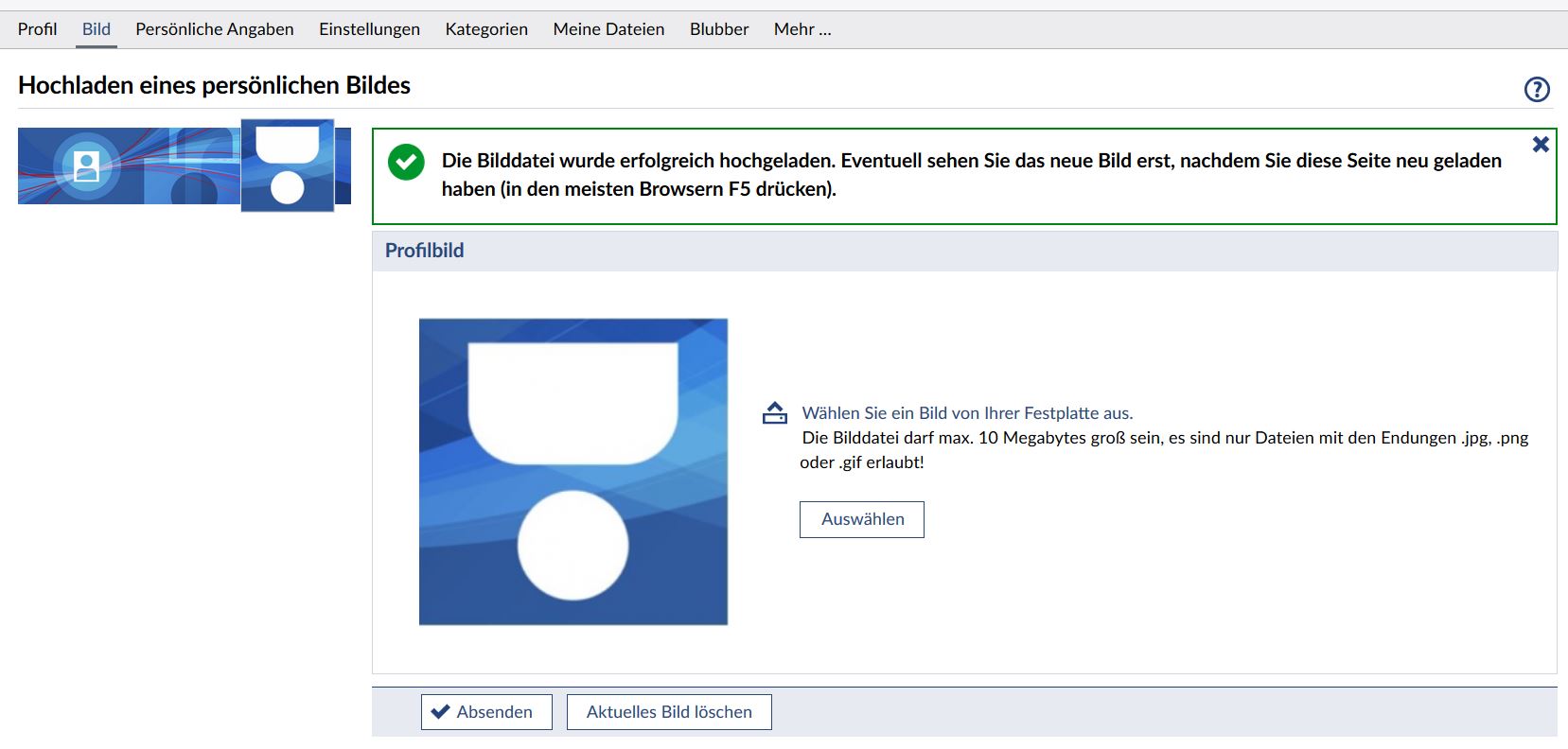 Beachten Sie folgende Regeln: Die Bilddatei darf max. 10 Megabytes groß sein, es sind nur Dateien mit den Endungen .jpg, .png oder .gif erlaubt!