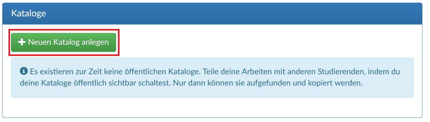 Aktuell existieren keine öffentlichen Kataloge. Öffentliche Kataloge können von allen Nutzenden gefunden und genutzt werden. Um öffentliche Kataloge zu personalisieren, gibt es die Möglichkeit öffentliche Kataloge zu kopieren. Diese Kopie kann dann bearbeitet werden. Sobald ein öffentlicher Katalog kopiert wurde, erscheint Ihr Name als dessen Urheber.