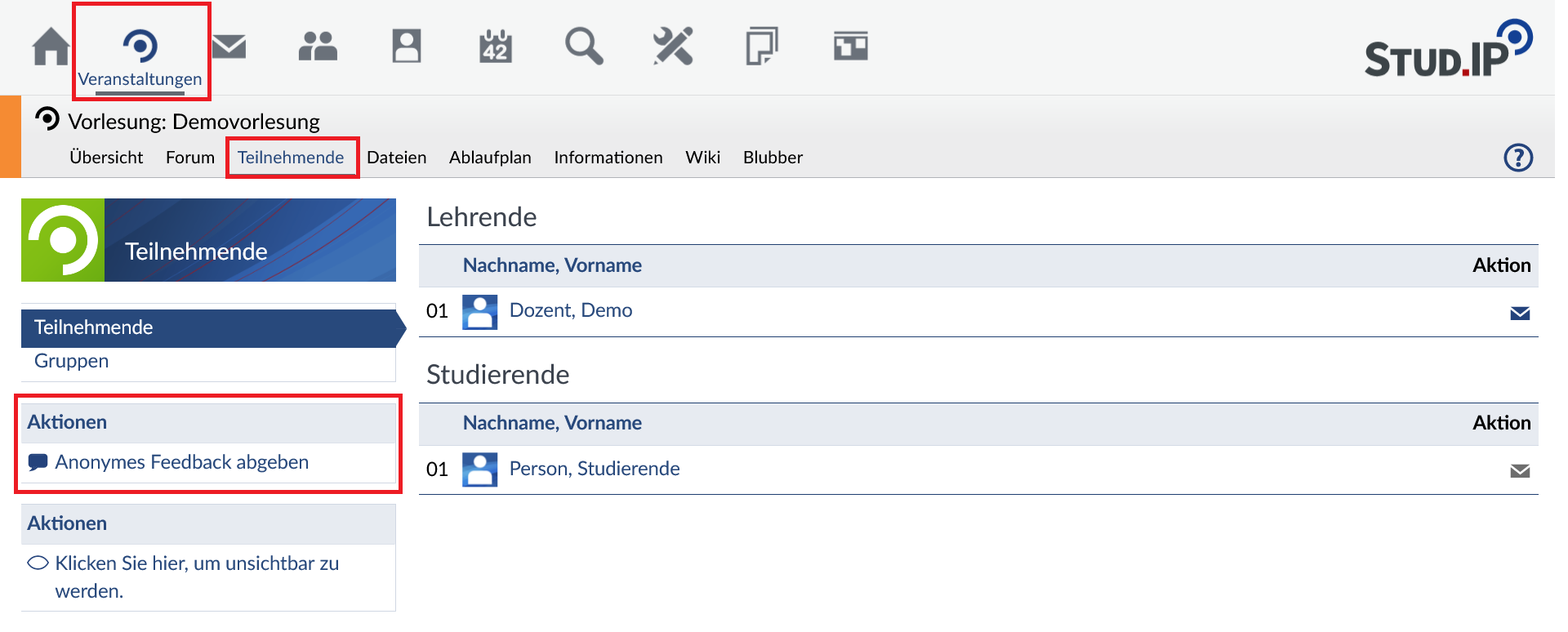 Für Studierende ist es möglich den Dozierenden einer Veranstaltung anonymes Feedback zu geben. Dieses anonyme Feedback ist ohne zeitliche Einschränkungen möglich im Gegensatz zu den Evaluationen. Die Dozierenden erhalten das anonyme Feedback über die Nachrichtenfunktion innerhalb von Stud.IP.