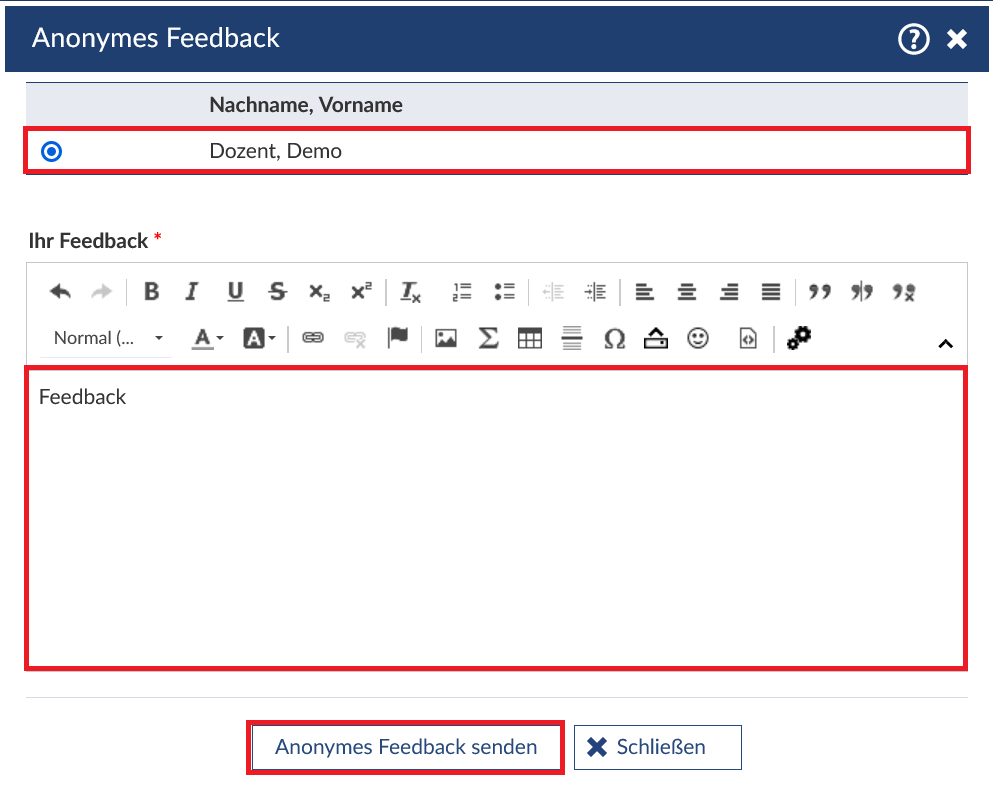 . Es öffnet sich ein neues Fenster, wo Sie die jeweilige dozierende Person auswählen müssen, die das anonyme Feedback erhalten soll. Unter "Ihr Feedback" fügen Sie dann den Text ein. Klicken Sie anschließend auf