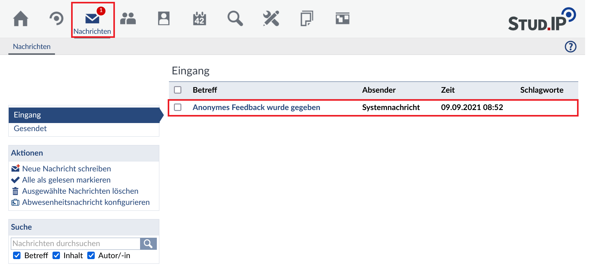 Dozierende erhalten das anonyme Feedback in Form einer internen Stud.IP-Nachricht. Sie werden über das Nachrichten-Icon darüber informiert, wenn es neue Nachrichten gibt.
