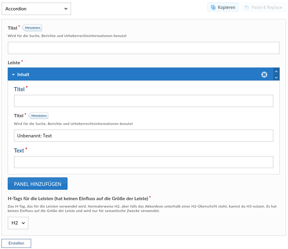 - Titel: Hier legen Sie den Titel des Panels fest, welches sich durch Klick darauf aufklappen lässt.