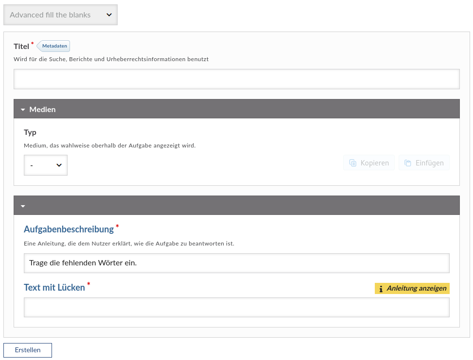 Mit der Vorlage Advanced fill the blanks haben Sie die Möglichkeit ein Modul bestehend aus einem Lückentext zu erstellen, in dem von den Studierenden die Lücken ausgefüllt werden müssen. Haben Sie diese Vorlage ausgewählt, erscheint eine Oberfläche mit den Einstellungsmöglichkeiten.
