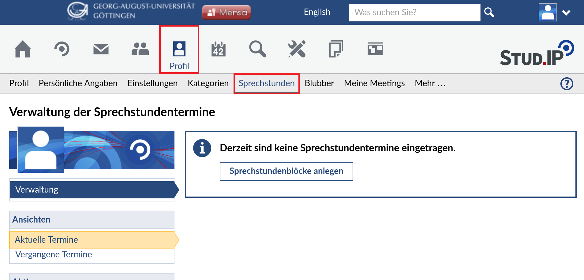 Die Sprechstundenfunktionen ermöglicht eine Terminverwaltung über das eigene Profil in Stud.IP. Um auf die Funktion zugreifen zu können, wählen Sie oben in der Hauptleiste „Profil“ nachdem Sie sich in Stud.IP eingeloggt haben. Navigieren Sie anschließend in den Reiter „Sprechstunden“.