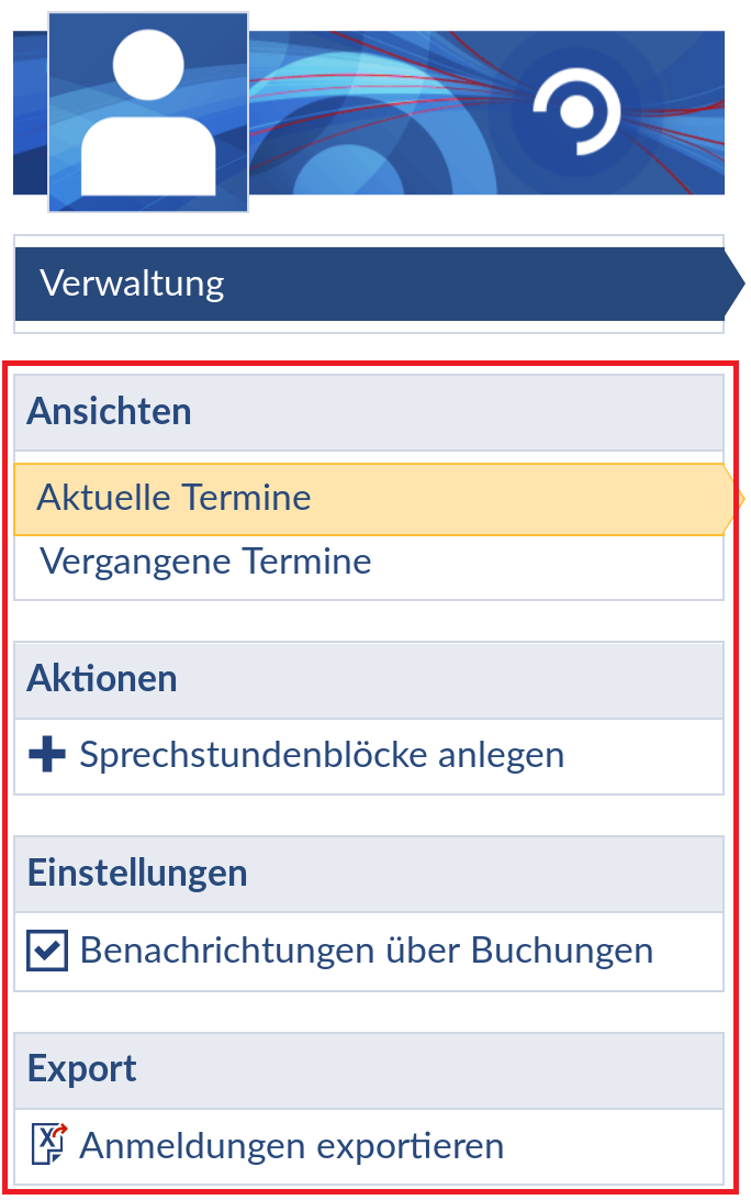 Sind „Aktuelle Termine“ gewählt, wird Ihnen eine Übersicht der aktuellen Sprechstundentermine angezeigt