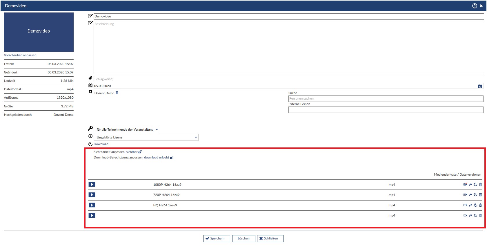 Darunter sehen Sie die Auflistung der Medienderivate / Dateiversionen. Um eine Version in einem neuen Fenster abzuspielen, klicken sie auf den