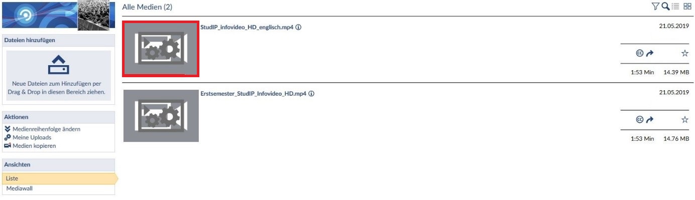 Es kann nun von den Teilnehmenden Ihrer Veranstaltung angesehen werden. Bitte beachten Sie, dass das Rekodieren der Mediendateien eine gewisse Zeit (etwa eine halbe Stunde) in Anspruch nehmen kann. Bis der Verarbeitungsvorgang abgeschlossen ist, sind in dem Video-Vorschaubild 2 Zahnräder zu sehen. Das Video ist in dieser Zeit nicht abspielbar.