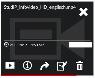 Zusätzlich sehen Sie einige Buttons. Sie können über diese Buttons das Video abspielen, das Infofenster aufrufen, das Video teilen, das Medium bearbeiten und das Medium löschen. Über das X verlassen sie dieses Menü.
