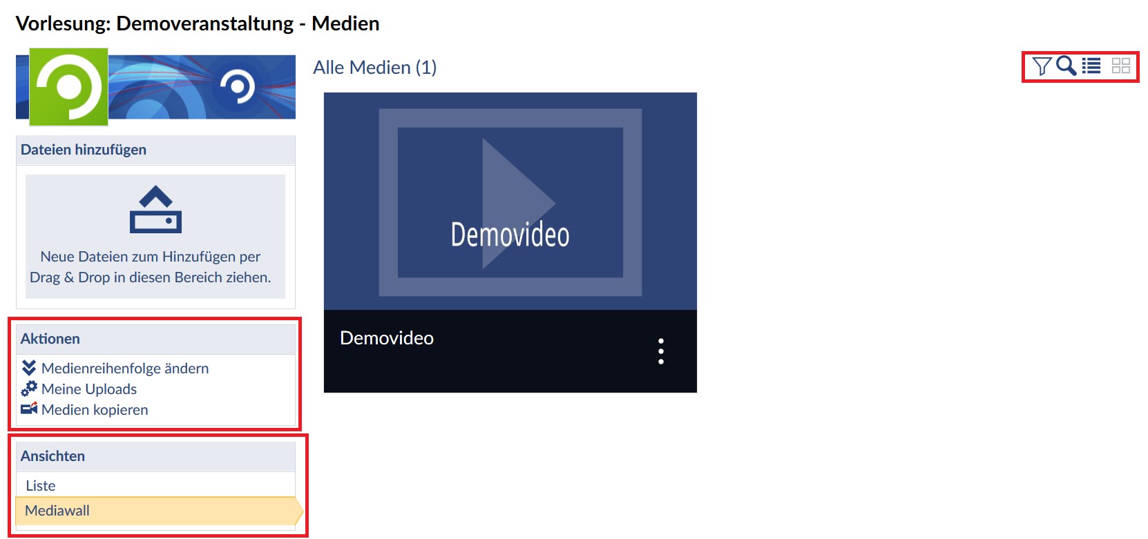 Mediawall Ansicht wechseln. Sie können die Ansicht auch oben rechts über die Schnellzugriff-Buttons wechseln. Auch können Sie dort die Videos