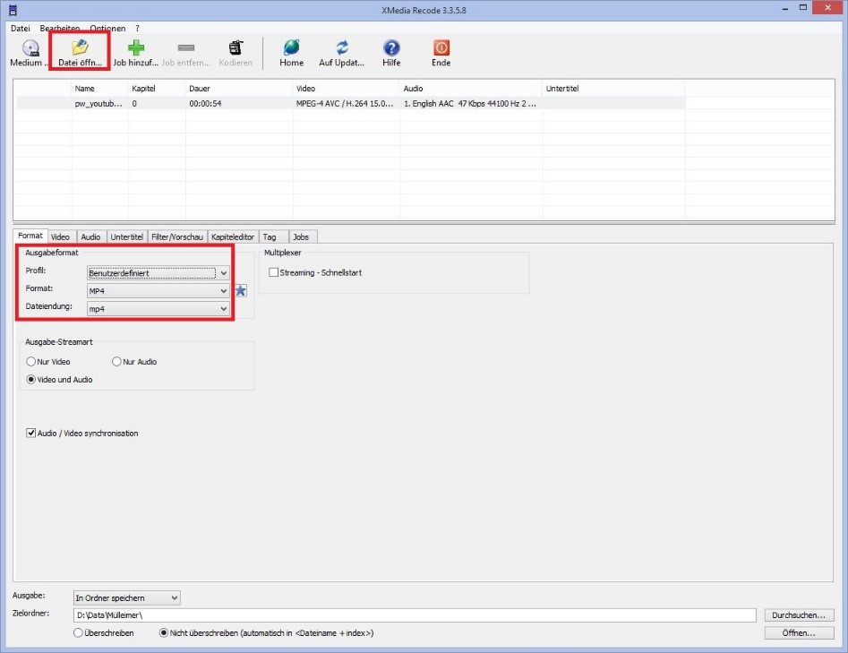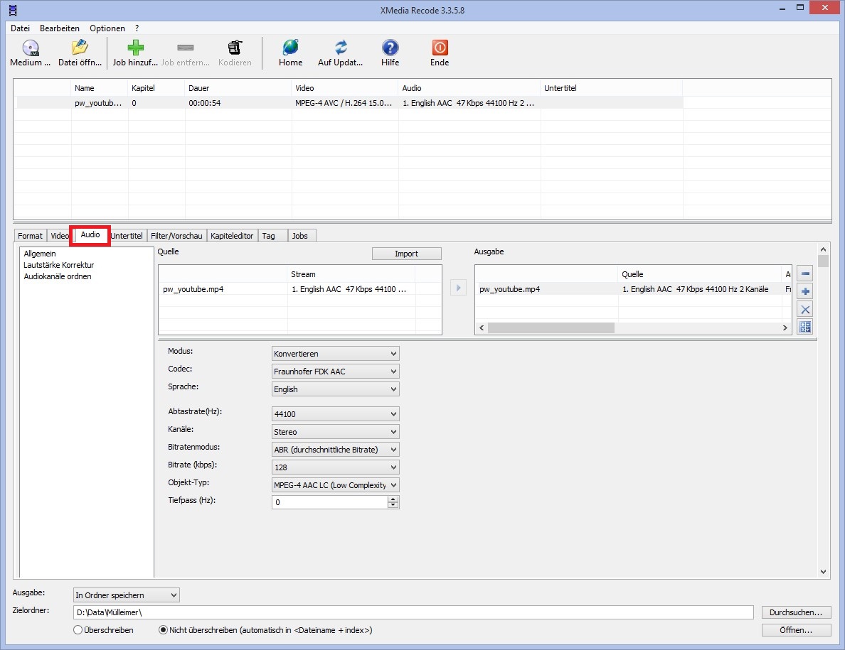 Neben Video- und Audio-Codec, Bitrate oder auch Lautstärke können Sie im „Video-“ und „Audio-“Reiter auch viele andere Parameter ändern. Bitte benutzen Sie hier einfach die vorausgewählten Einstellungen.