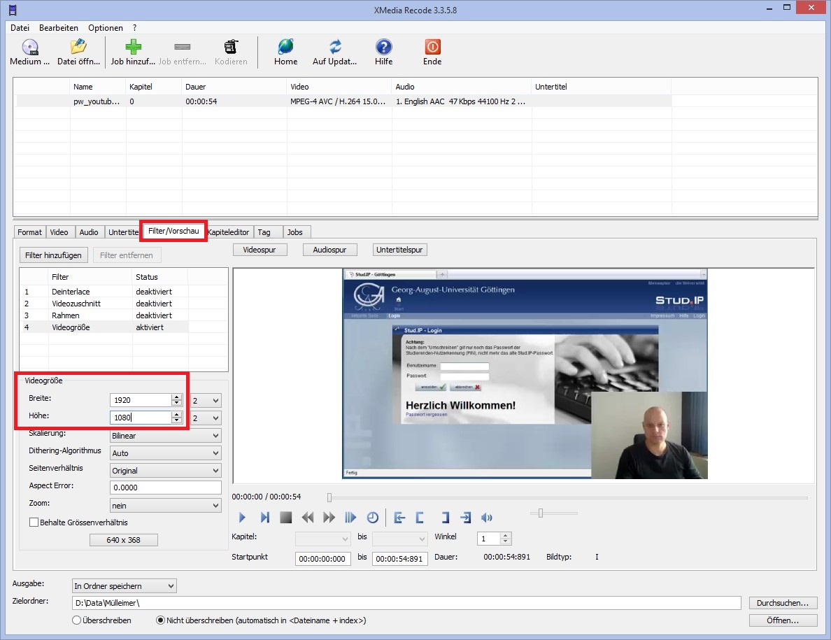 Im Reiter „Filter/Vorschau“ stellen Sie bitte die Videogröße auf FullHD (1920 x 1080) um.