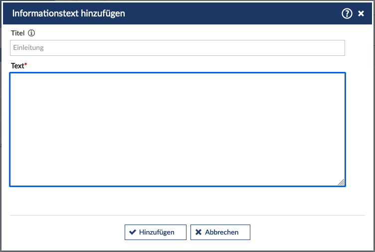 In der Seitenleiste befindet sich die Aktion "Informationstext hinzufügen", diese öffnet folgenden Dialog: