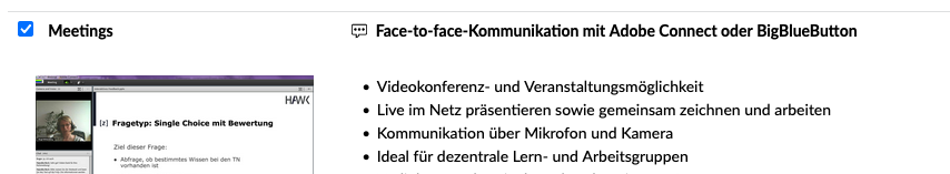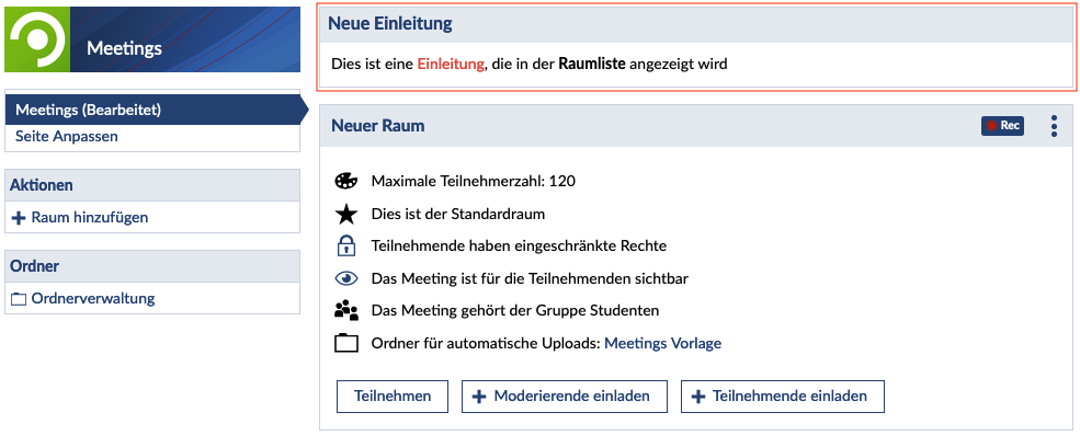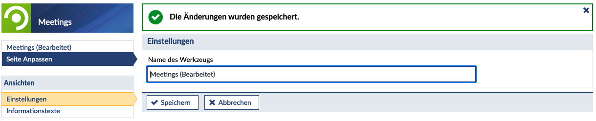 Mit dieser Funktion können Sie die Erscheinung des Meetings-Werkzeugs anpassen. Aktuell können Sie einen Einleitungstext hinterlegen und den Namen von Meetings in der Navigationsleiste ändern.