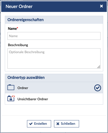 Mit der Schaltfläche Neuer Ordner, die einen weiteren Dialog öffnet, können Sie einen neuen Ordner zum aktuell ausgewählten Ordner im Hauptdialog hinzufügen.