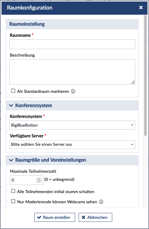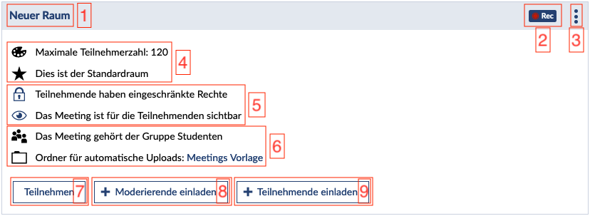 Auf Wörter wie "Raum" oder "Meeting" beziehen sich auf das mit diesem Werkzeug erstellte Element, welches den eigentlichen VK-Raum auf einem Server repräsentiert.
