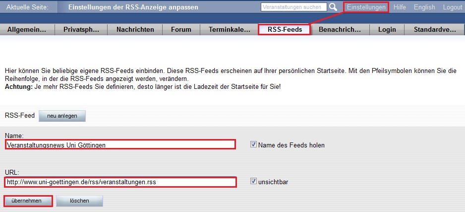 Soll der RSS-Feed auf Ihrer persönlichen Startseite erscheinen, entfernen Sie vorher den Haken bei "unsichtbar".