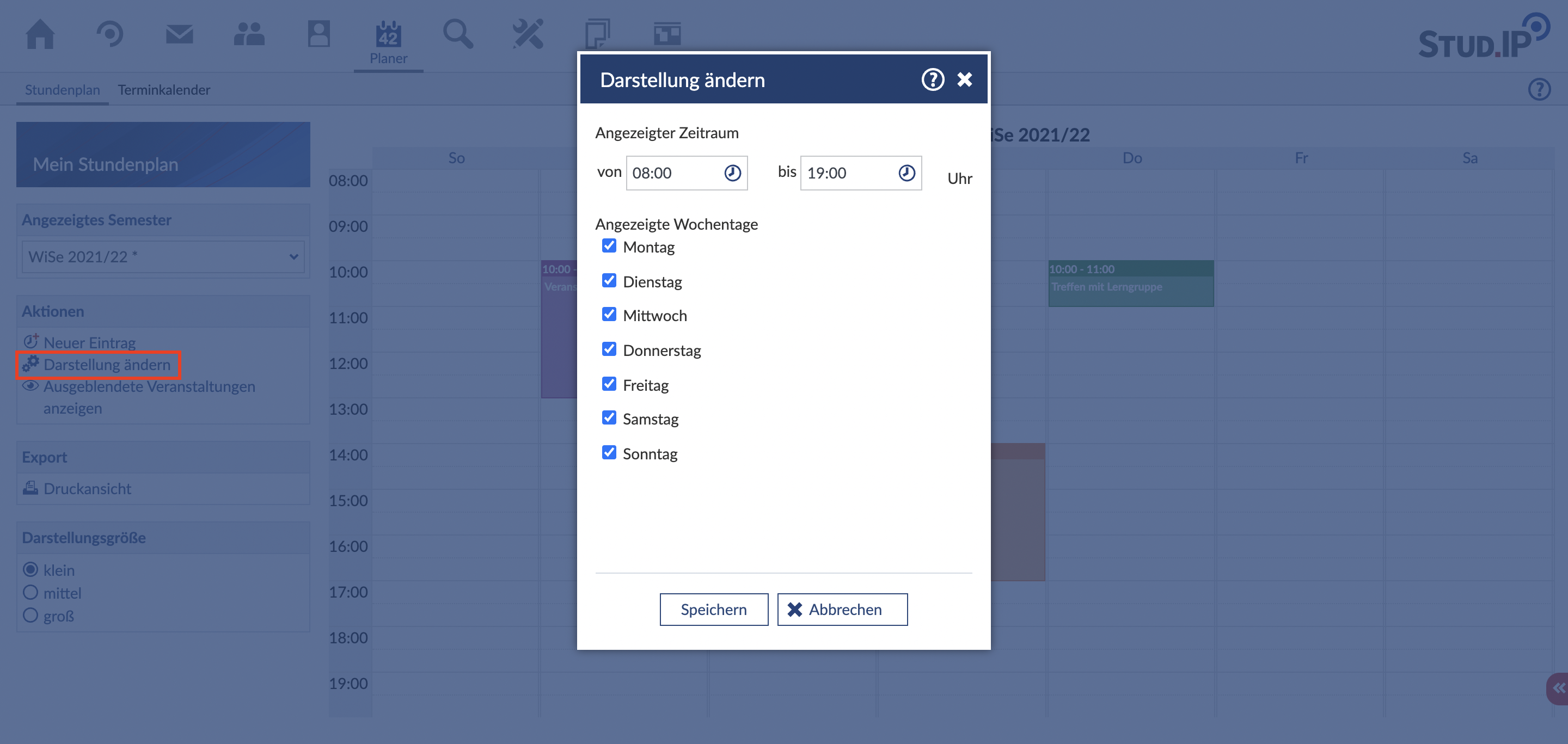Es gibt noch weitere Möglichkeiten, den Stundenplan Ihren Bedürfnissen anzupassen. Klicken Sie dazu in der Sidebar auf "Einstellungen ändern". Es erscheint ein modaler Einstellungsdialog, in welchem Sie das angezeigte Semester, den angezeigten Zeitraum sowie die angezeigten Wochenende ändern können. Ein Klick auf "speichern" übernimmt diese Änderungen für Ihren Stundenplan.