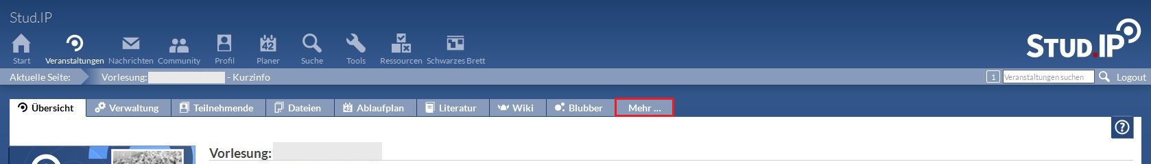 Gehen Sie, zur Aktivierung des Lerntagebuches, in die Veranstaltung, in der Sie das Tool verwenden möchten. Wählen Sie den Menüpunkt "Mehr…" aus. Auf dieser Seite können Sie die Inhaltselemente Ihrer Veranstaltung konfigurieren und zusätzliche PlugIns aktivieren oder deaktivieren.